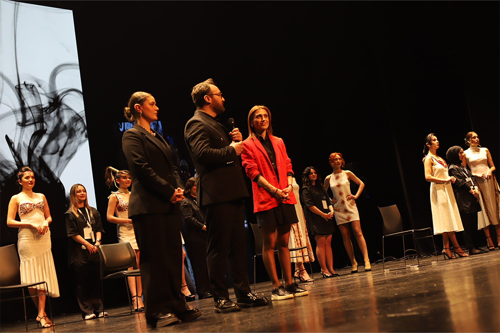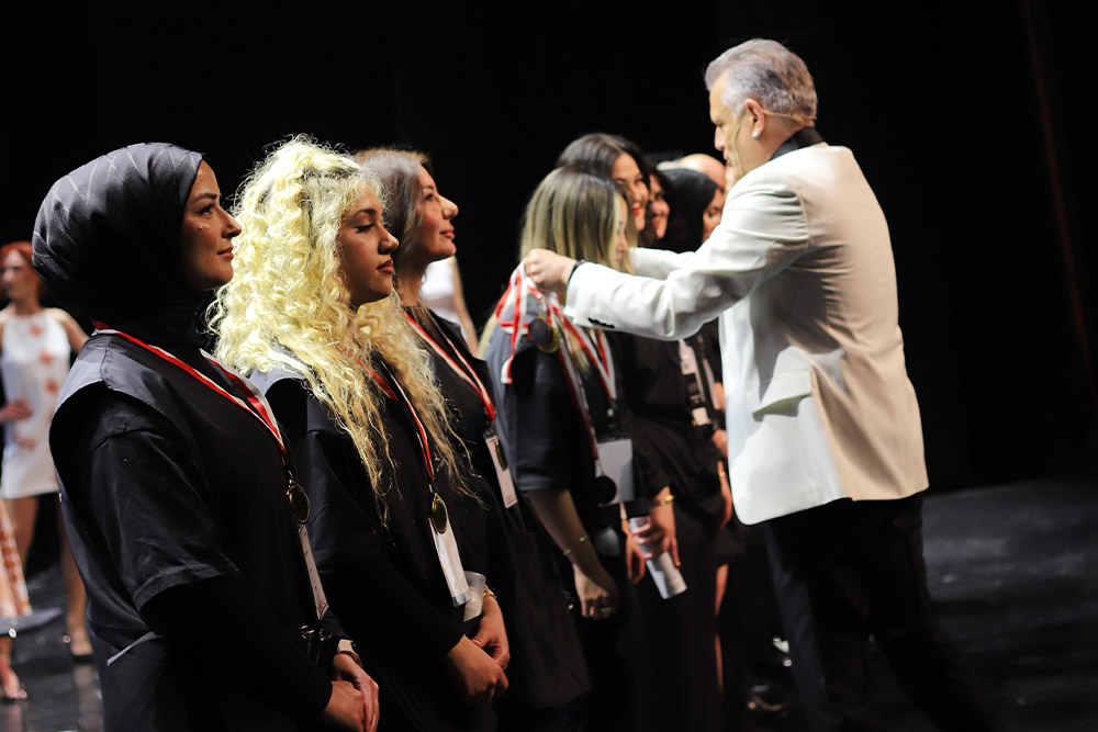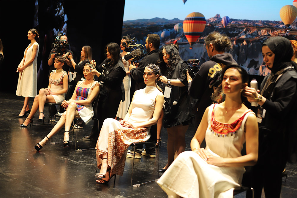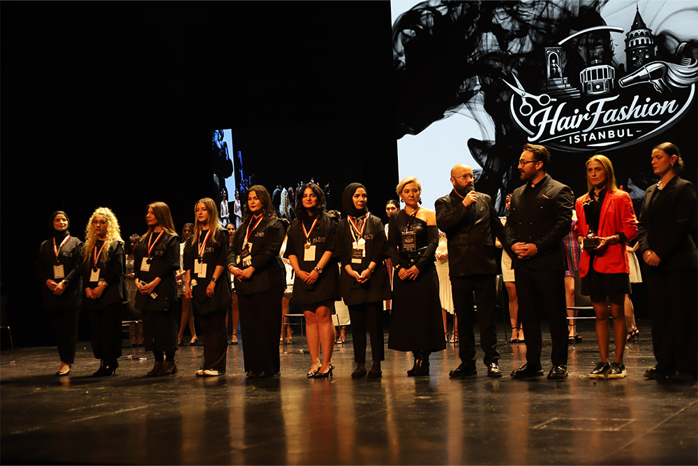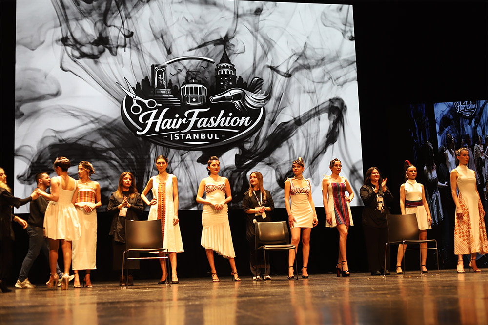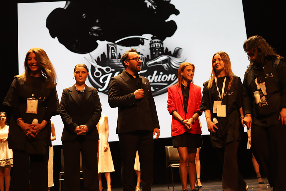 Sahnede performans sergileyen 7 öğrencimizin her biri iki farklı model ile birebir çalışarak saç tasarımlarını profesyonel bir akışta gerçekleştirdi.